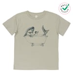 Our kids' T-shirts are a classic box shape cut, perfect for boys or girls under 12 or very tiny adults. They are sized by age in two-year groups. Check the sizing chart for the relevant info on age-related height and width dimensions as kids grow at different speeds. It depends on what you're feeding them right ;-)